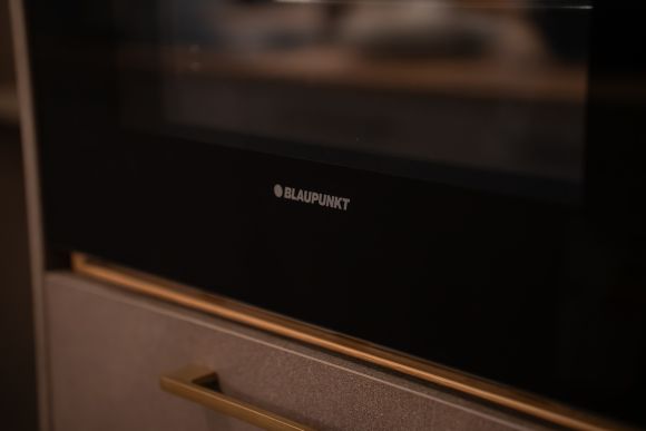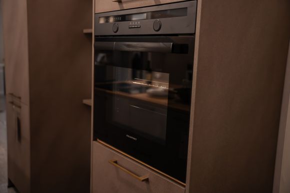 Ein etwas anderes Schmuckstück ist die Ausstellungsküche 33. Sie erschafft mit ihren modernen schwarzen Fronten sowie der Kücheninsel und dem Victoria Nostalgie-Standherd TR93 von SMEG eine ganz besondere Atmosphäre. Die Kücheninsel dient als reine Arbeitsfläche und ermöglicht zusätzlichen Stauraum für alle Küchenutensilien. Gegenüber befindet sich die Küchenzeile mit Spülbecken, dunklen Holzarbeitsplatten und dem hellgrau lackierten Herd von SMEG im Style der 50er Jahre. Dieser Herd verfügt nicht nur über 5 Induktionskochfelder, sondern lässt die Herzen durch gleich drei Backöfen (Grill-Ofen, Multifunktionsbackofen und Heißluftbackofen) höherschlagen.